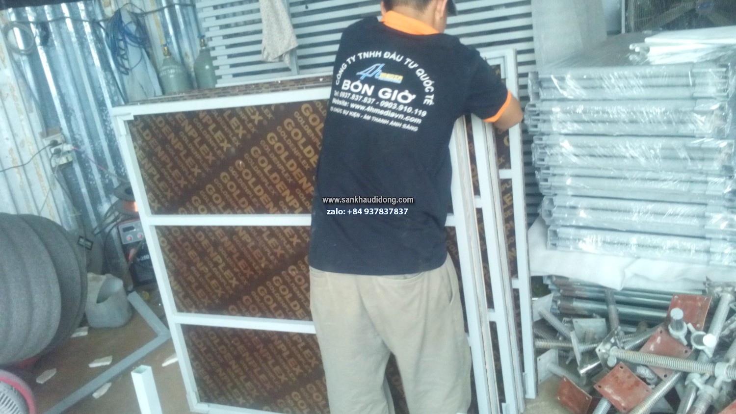Mặt sàn sân khấu được ốp ván ép, ván ép phủ keo trong, ván phủ flim chống nước, Ván nhựa PVC Foam, Mica màu, Aluminium đạt tiêu chuẩn quốc tế, rất nhẹ, bền và phù hợp cho các chương trình sự kiện lớn.